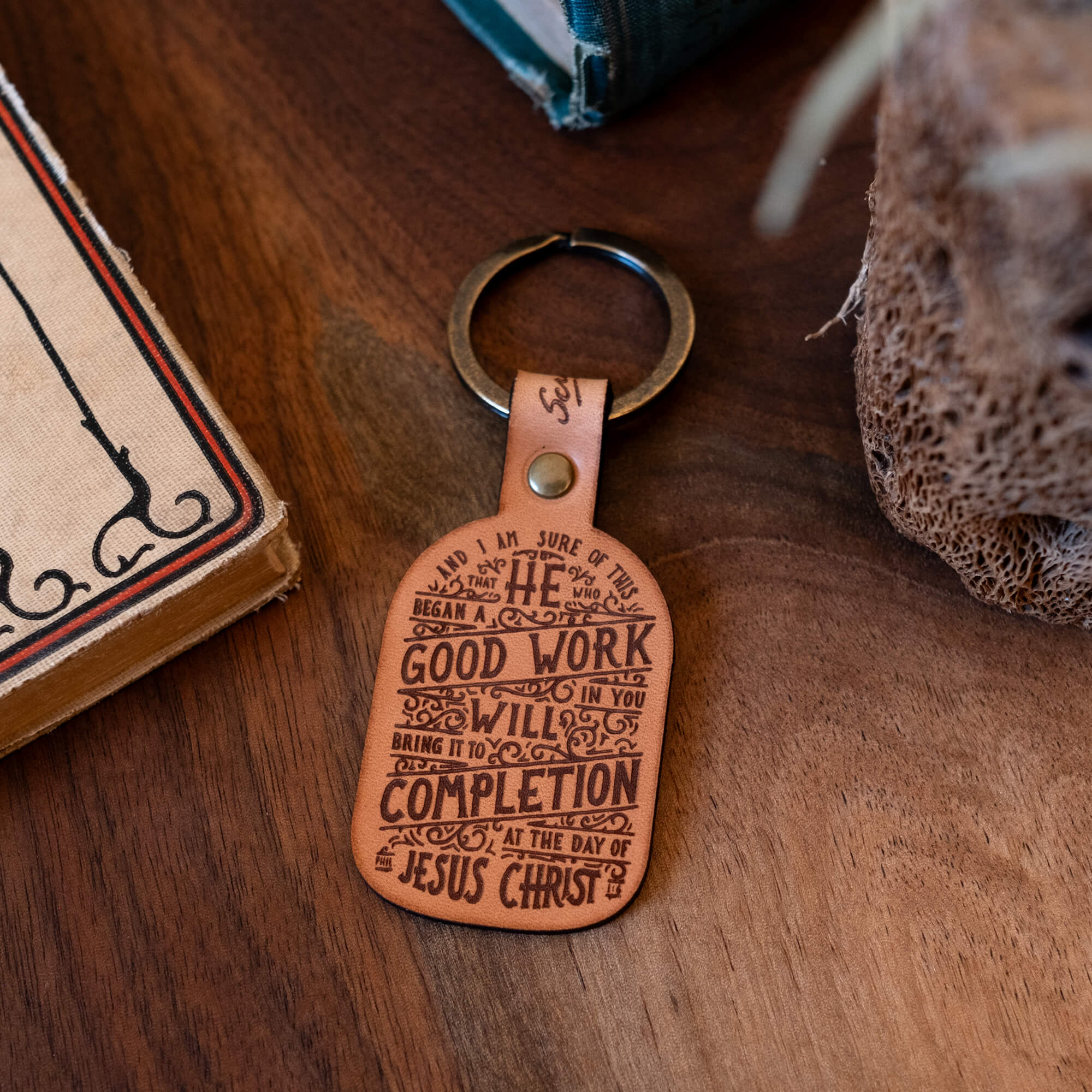 This leather keychain is laser burned with our hand-drawn design of Philippians 1:6 and is ready to be attached to your keys or backpack and taken along as a reminder of truth throughout the day.