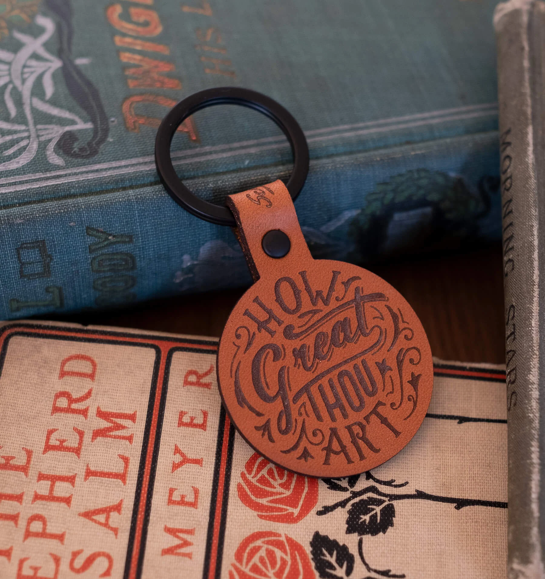 This leather keychain is laser burned with our hand-drawn design of How Great Thou Art and is ready to be attached to your keys or backpack and taken along as a reminder of truth throughout the day.