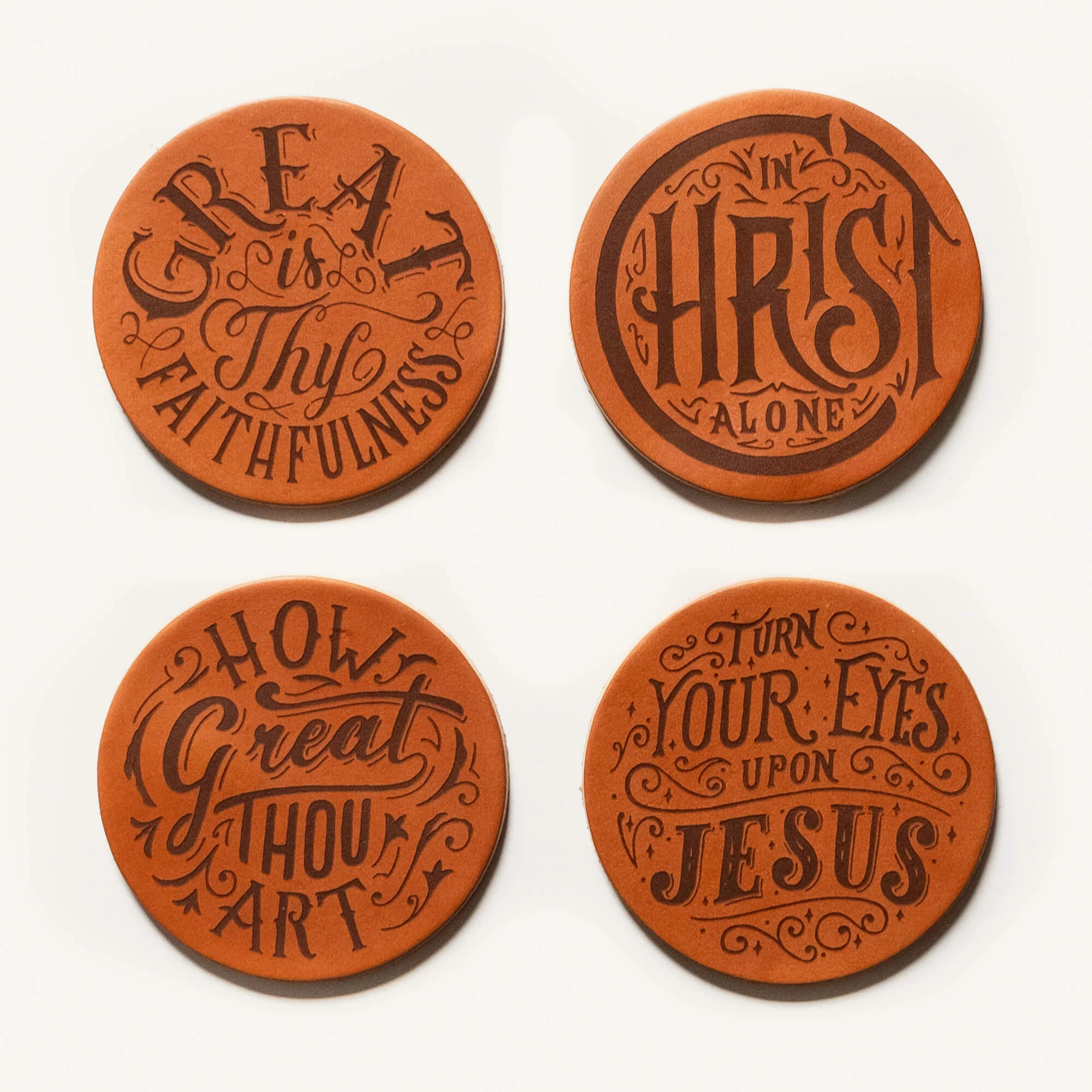 This set of four leather coasters features the titles of some of our favorite hymns: Turn Your Eyes Upon Jesus, How Great Thou Art, In Christ Alone, and Great Is Thy Faithfulness. They are thick enough to protect your tabletop and also make it look nice as they sit and wait to do their job.
