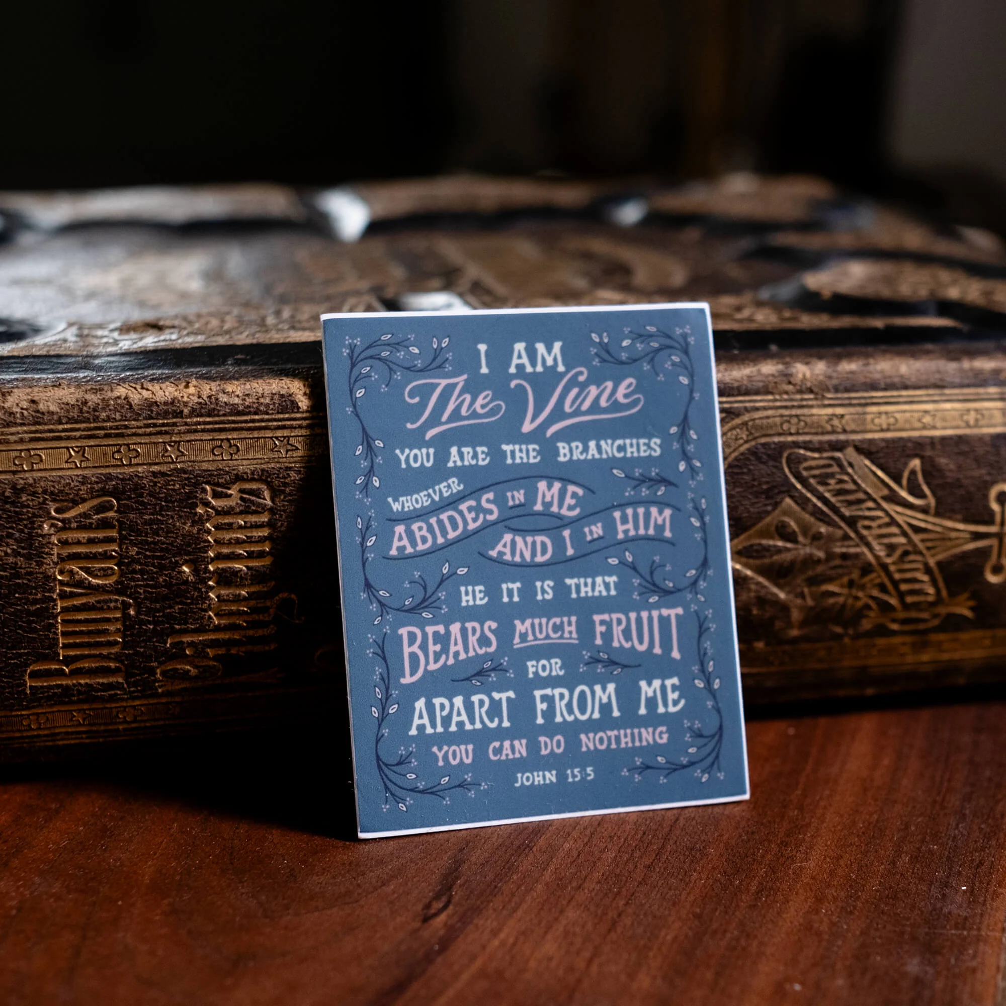 Featuring our design of John 15:5, this sticker is ready to adorn a journal, laptop, car, water bottle, or just about anything, really.
