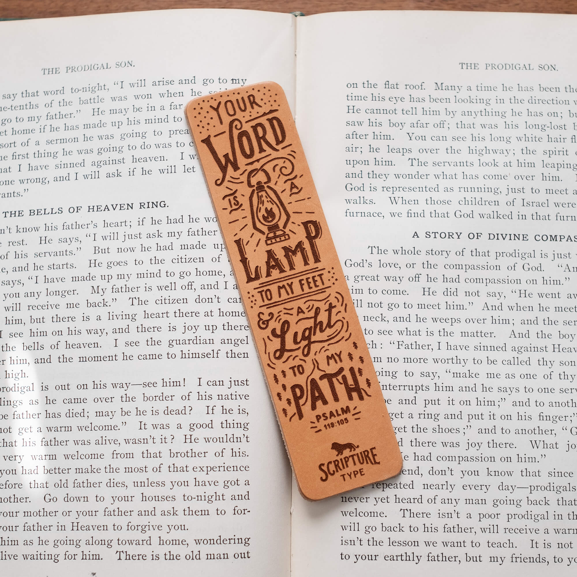 This leather bookmark featuring our hand-drawn design of Psalm 119:105 is thin enough to fit nicely inside the pages of your book, holding your place for you just as a good bookmark should.
