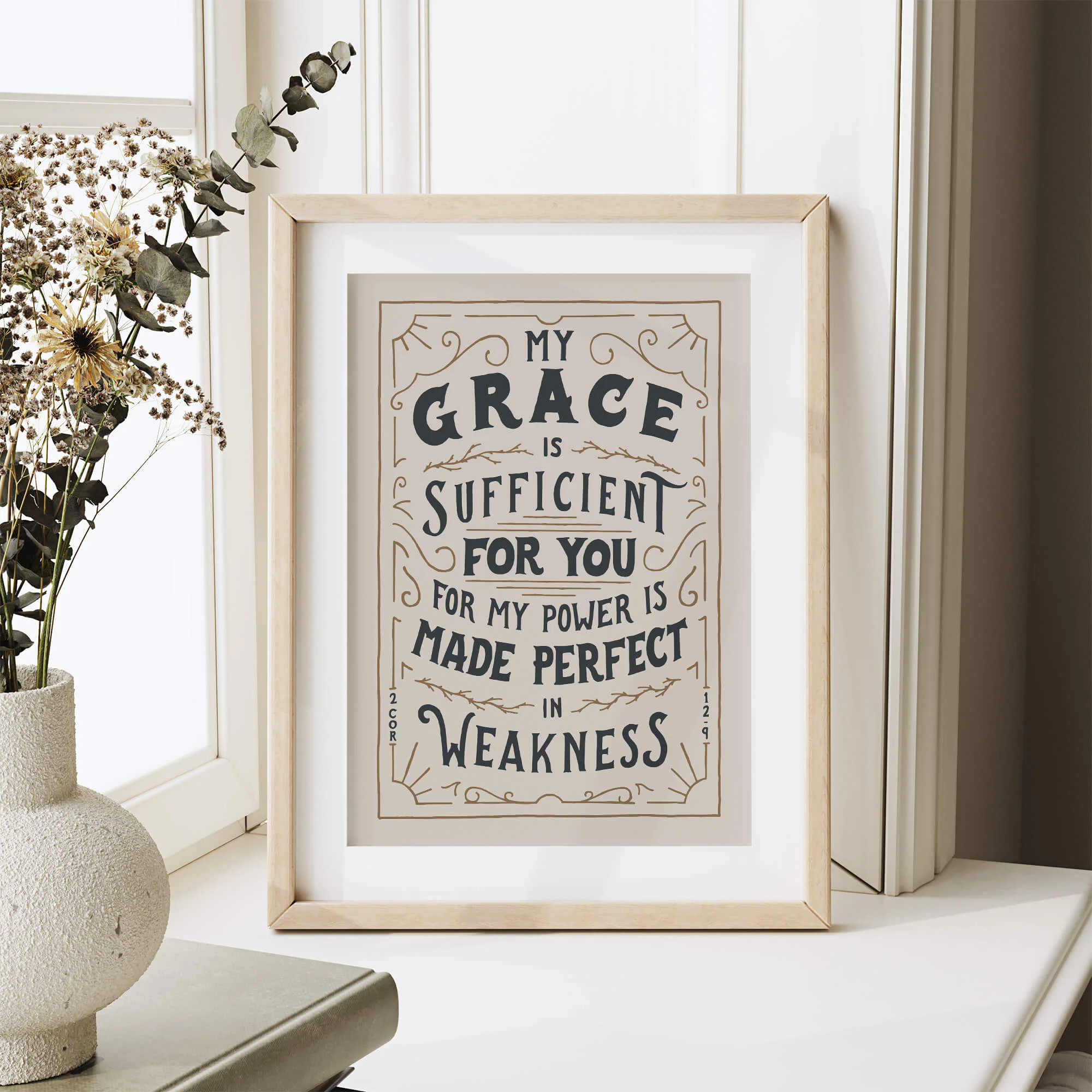 This design of 2 Corinthians 12:9 has been thoughtfully drawn by hand, making it a meaningful encouragement and unique conversation starter for your home, church, school, or office.
