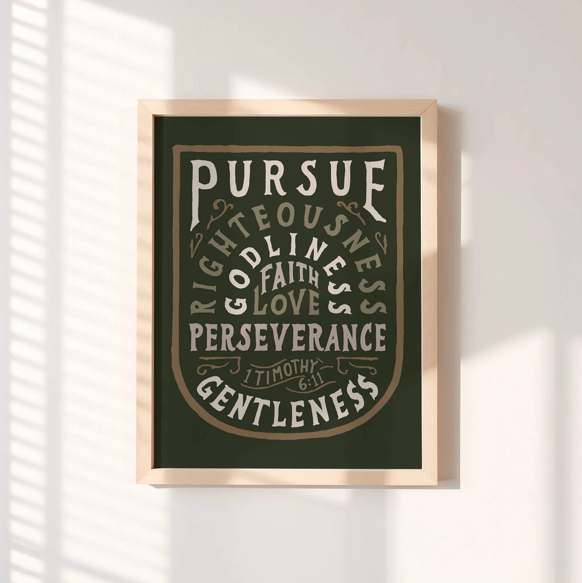 This design of 1 Timothy 6:11 has been thoughtfully drawn by hand, making it a meaningful encouragement and unique conversation starter for your home, church, school, or office.