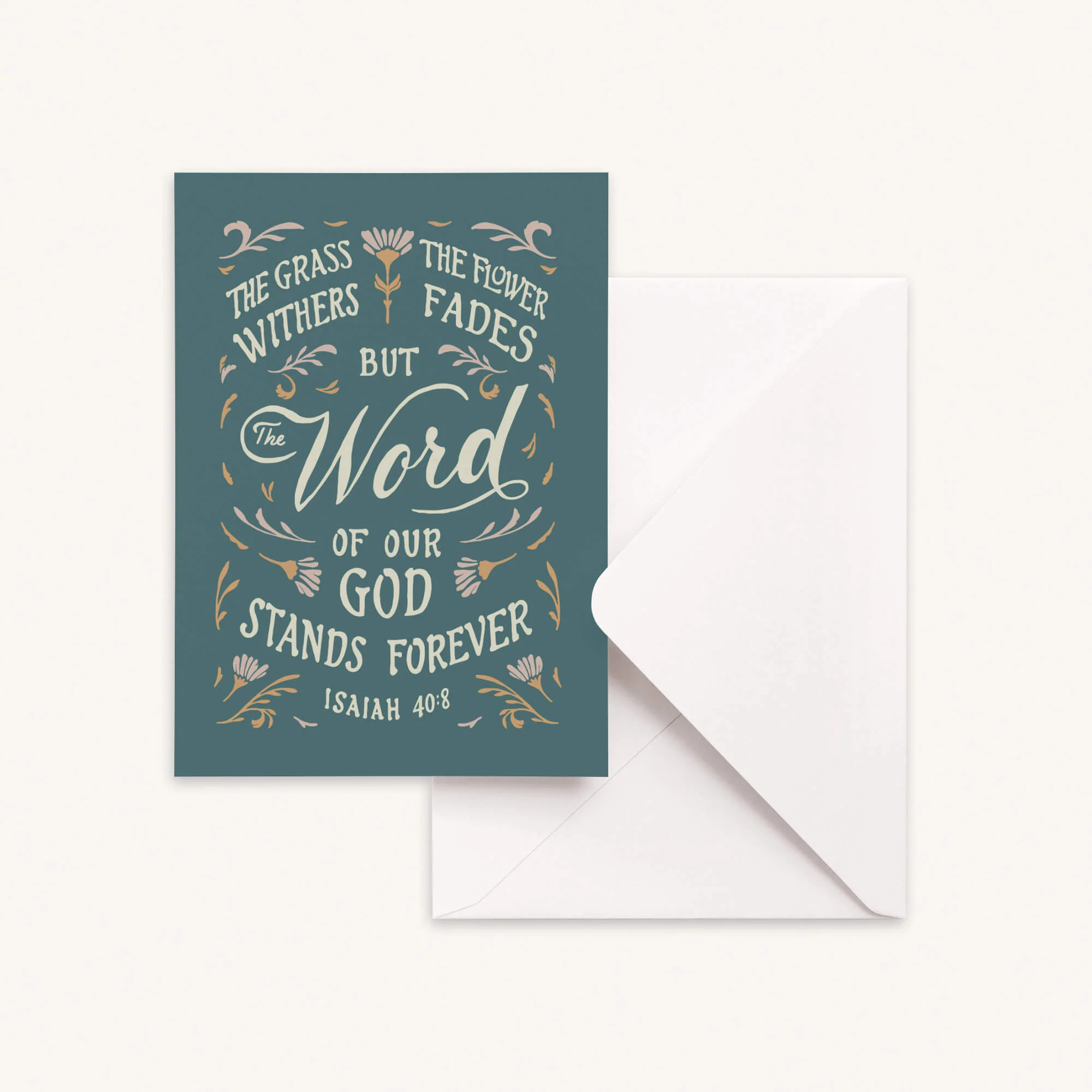 Send an encouraging note to family or friends with this greeting card featuring our hand drawn design of Isaiah 40:8. A blank interior leaves you plenty of space for your own handwritten note.