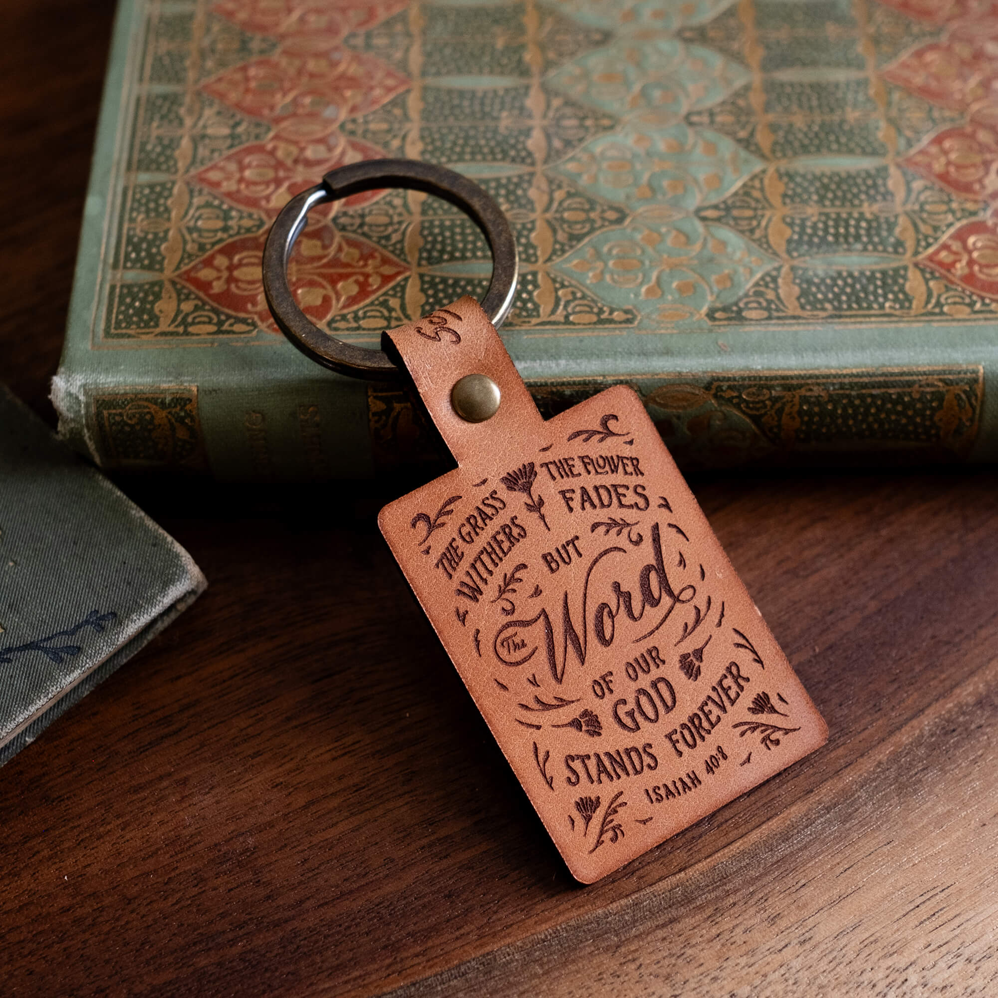 This leather keychain is laser burned with our hand-drawn design of Isaiah 40:8 and is ready to be attached to your keys or backpack and taken along as a reminder of truth throughout the day.