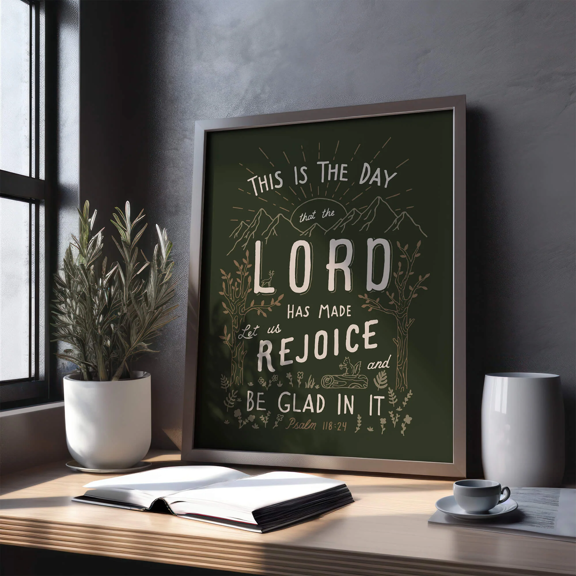 This design of Psalm 118:24 has been thoughtfully drawn by hand, making it a meaningful encouragement and unique conversation starter for your home, church, school, or office.