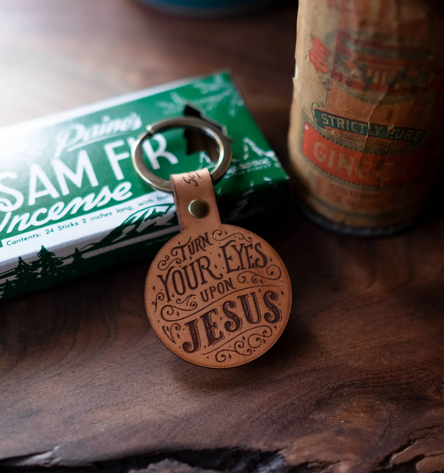 This leather keychain is laser burned with our hand-drawn design of Turn Your Eyes Upon Jesus and is ready to be attached to your keys or backpack and taken along as a reminder of truth throughout the day.