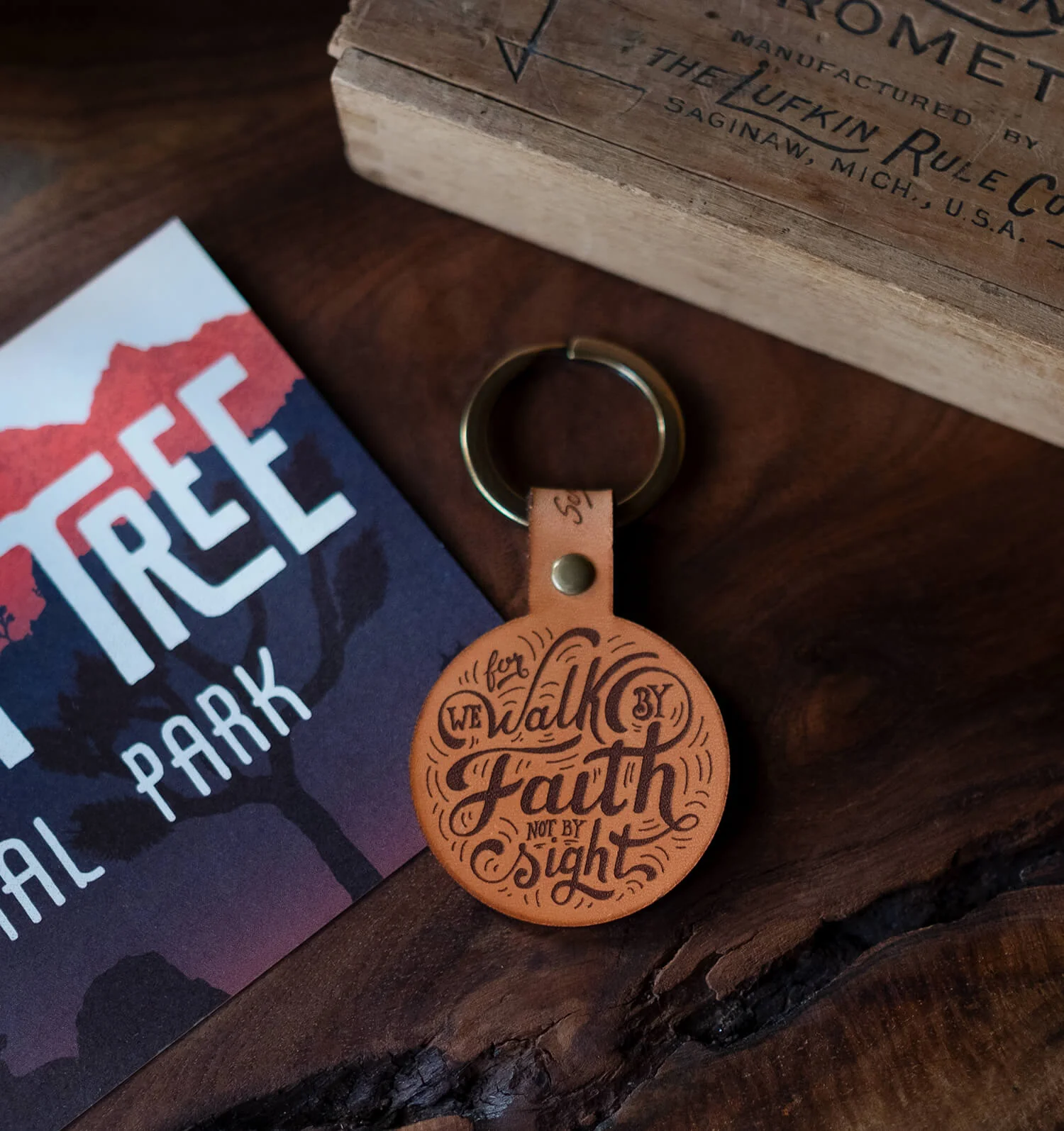 This leather keychain is laser burned with our hand-drawn design of 2 Corinthians 5:7 and is ready to be attached to your keys or backpack and taken along as a reminder of truth throughout the day.