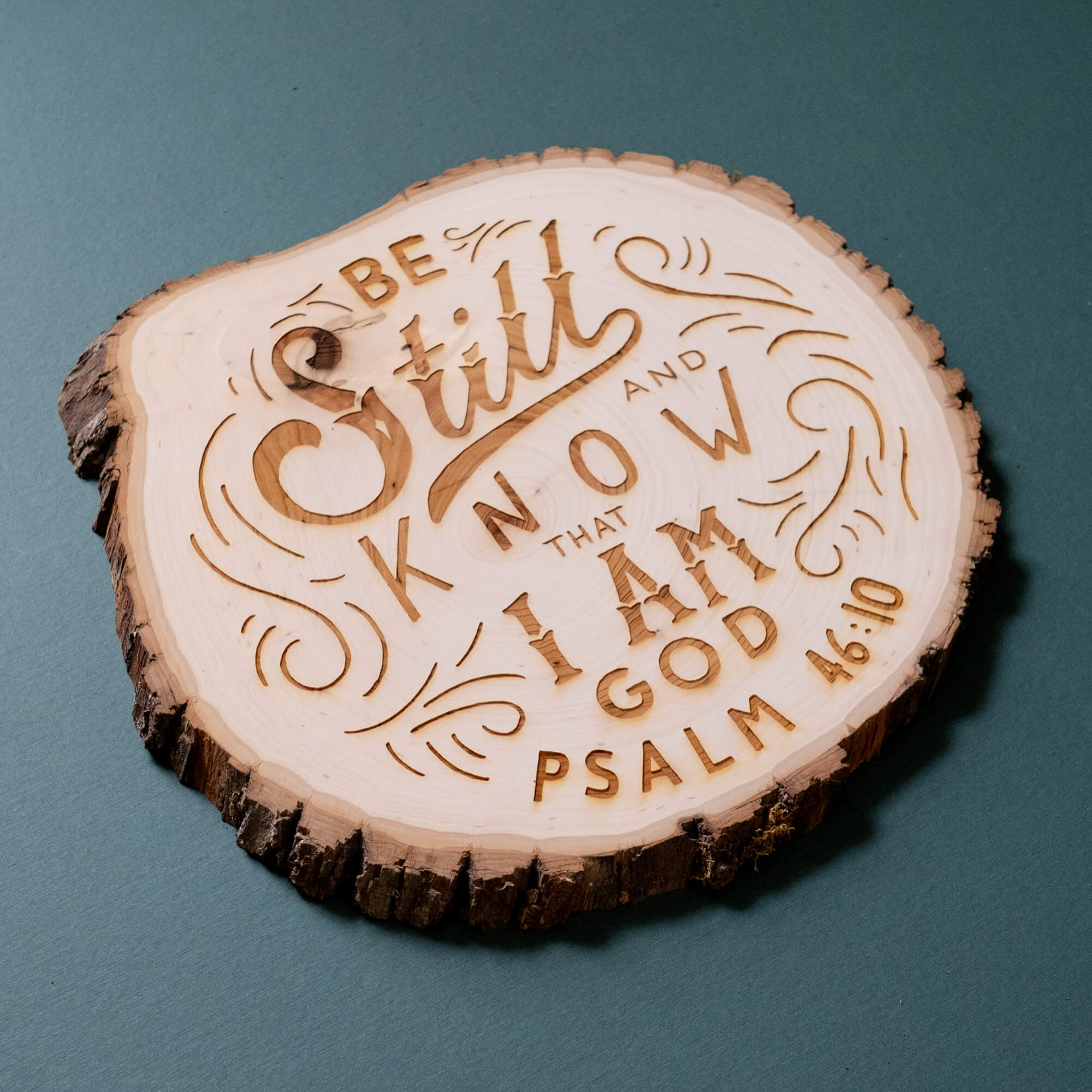 A solid slice of natural live-edge basswood, laser-burned with our hand-drawn design of Psalm 46:10, making it a meaningful encouragement and unique conversation starter for your home, church, school, or office.