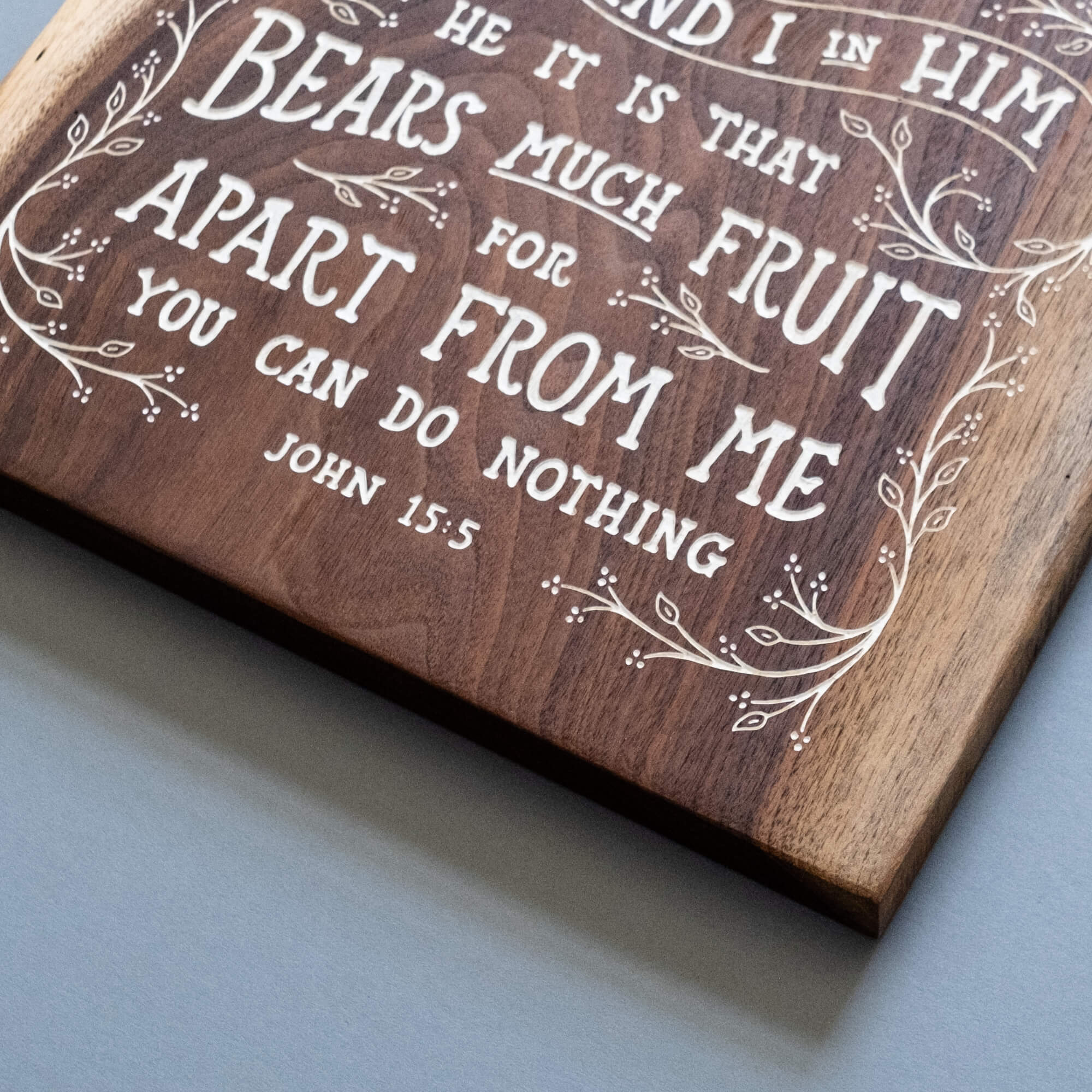 This piece of art is handcrafted from local, salvaged walnut wood and laser-burned with our original design from John 15:5.