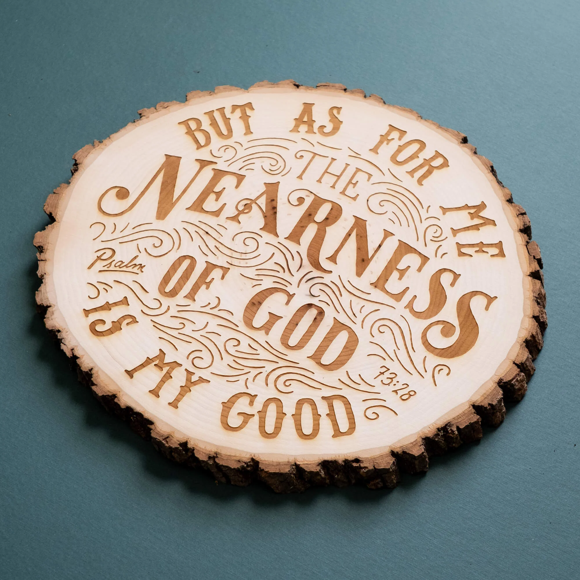 A solid slice of natural live-edge basswood, laser-burned with our hand-drawn design of Psalm 73:28, making it a meaningful encouragement and unique conversation starter for your home, church, school, or office.