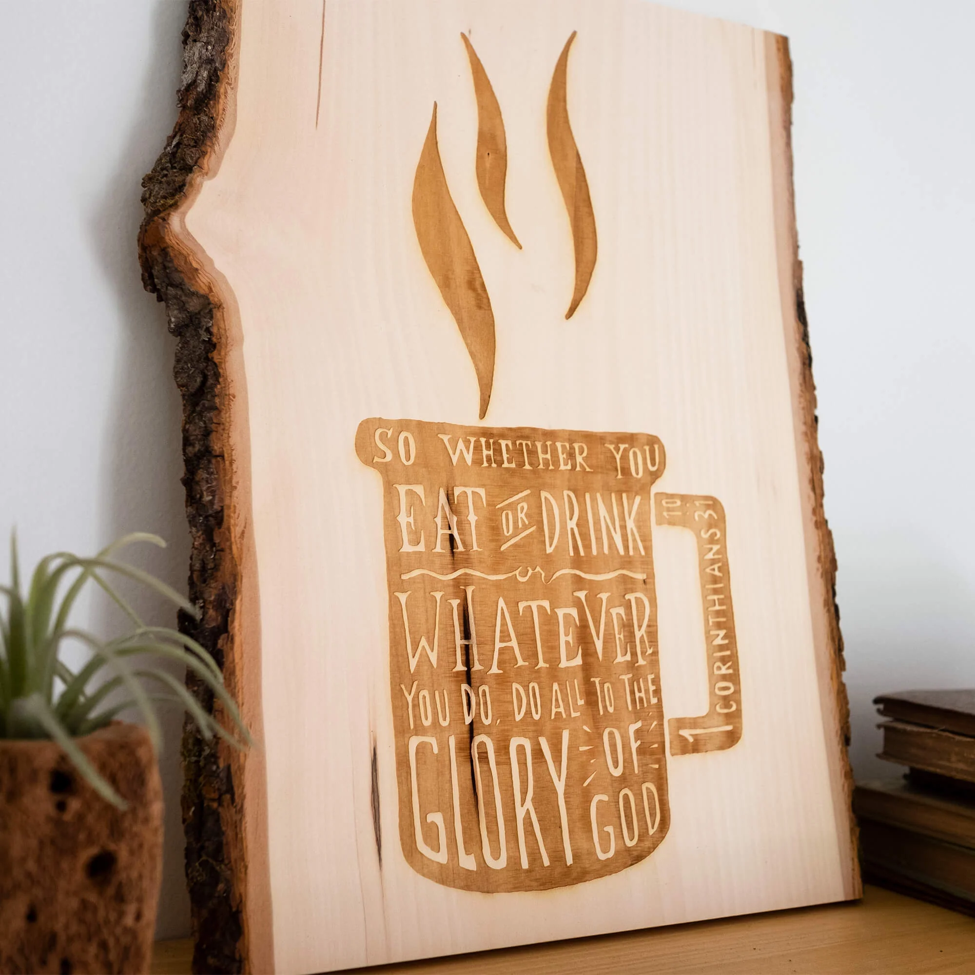A natural slab of basswood laser burned with your choice of any one of our hand-drawn designs, making it a unique conversation starter for your home, church, school, or office.