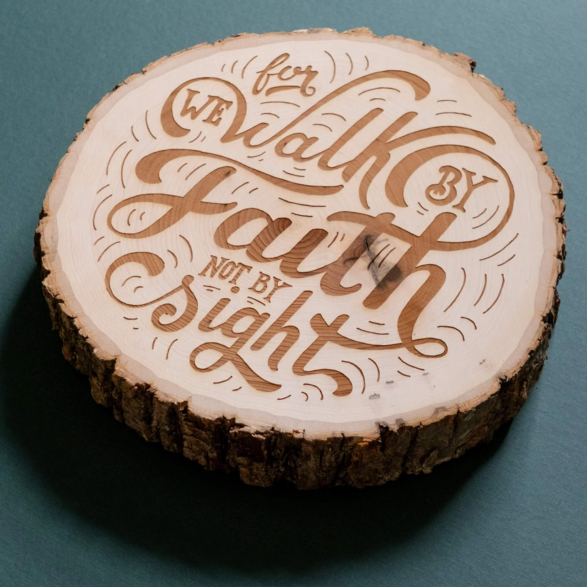 A solid slice of natural live-edge basswood, laser-burned with our hand-drawn design of 2 Corinthians 5:7, making it a meaningful encouragement and unique conversation starter for your home, church, school, or office.